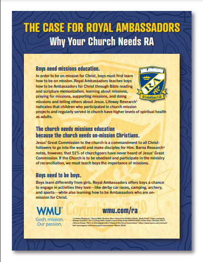 Royal Ambassadors (RA) is a missions discipleship group for boys in grades 1–6.